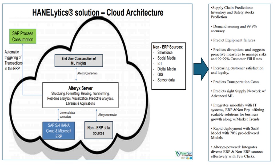 Technically, HANELYTICS® combines enterprise data integration (ERP + non-ERP sources) with data modeling, machine learning, statistical forecasting, big data processing, and continuous learning to deliver predictive insights at scale. Core capabilities include demand forecasting, inventory predictivity, disruption prediction, and supplier performance intelligence, built on an enterprise architecture using SAP HANA (real-time analytics), Hadoop (large-scale storage), Apache Spark (ML processing), data federation across sources, and cloud/hybrid deployment options—integrating with SAP S/4HANA, SAP cloud (private edition), and SAP/non-SAP systems via APIs so insights can be embedded directly into operational workflows.