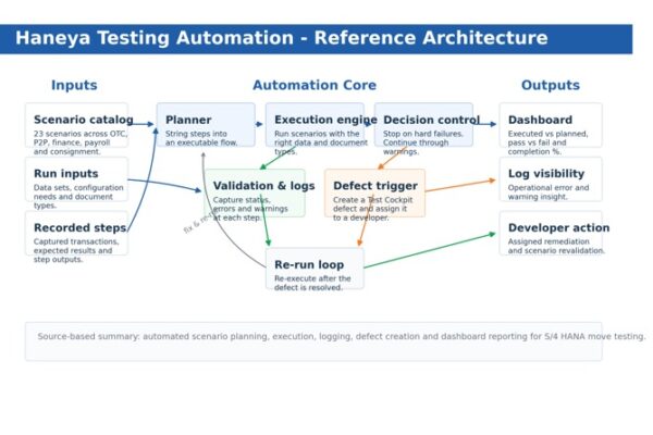 Overall, Haneya Testing Automation helps organizations achieve faster testing cycles, improved quality assurance, and greater transparency during SAP S/4 HANA transformation initiatives. By combining scenario planning, automated execution, defect governance, and dashboard reporting, Haneya provides a reliable framework for ensuring that complex enterprise processes continue to function smoothly in the new SAP environment.